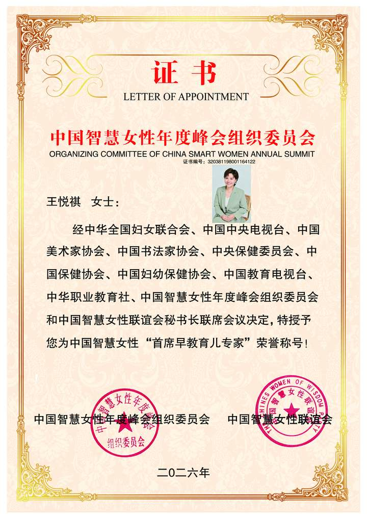 ◦ 2026年中国智慧女性“首席早教育儿专家”荣誉称号