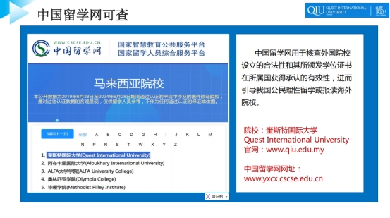 奎斯特国际大学(Quest International University,简称QIU)是马来西亚高等教育领域的综合性标杆院校,已通过马来西亚高等教育部(MOHE)权威认证,同时被列入中国教育部教育涉外监管信息网公示名单,其学历资质的规范性与认可度获得双重保障,为学员学术深造与职业发展奠定坚实基础。