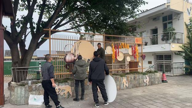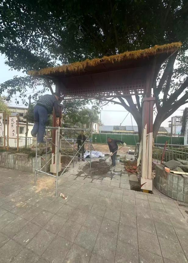 2026年1月3日,第三期微更新活动聚焦茶园右侧区域,开展景观小品打造工作,为系列微更新活动画上圆满句号。前期,“梨花微更新团”提前商讨确定活动细节,社工团队与施工团队完成物资筹备、场地规划等准备工作。活动现场,工作人员先明确分工职责与施工安全规范,专业施工团队依次开展基坑开挖、方管固定、混凝土浇筑等基础施工,社区居民主动协同配合,运输建材、夯实地基,全程参与施工过程。随后,大家合力完成圆锌管仿竹结构组装、钢架刷漆防锈、结皮板UV画面安装等工序,并搭配玉米、辣椒、竹编盘等民俗元素进行装饰,一步步还原出富有乡土气息的实景效果。当日16时,茶园右侧景观改造工程全面完工,居民们又自发投身现场清理工作,用实际行动践行社区共建理念。