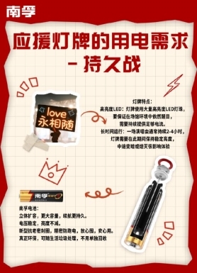 还有一点需要注意,应援灯牌的电池大多是5号规格,不同颜色、不同灯珠数量的灯牌对电池数量要求不同,出发前可以先检查一下自己的灯牌电池盒需要几节电池,按需求准备足量的南孚电池。如果是和朋友一起去,还可以互相多备几节,以备不时之需。