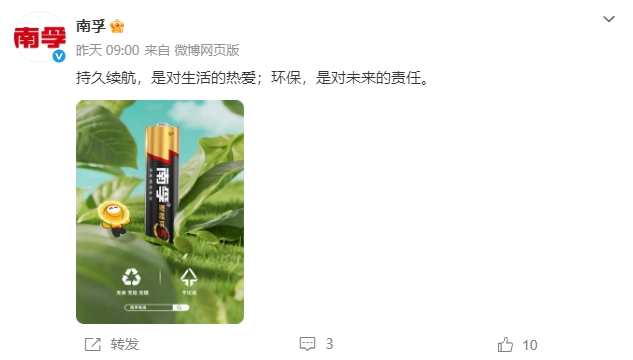 近日,南孚电池官微那句“持久续航,是对生活的热爱;环保,是对未来的责任”,精准道破了品牌深耕多年的核心追求。在日常场景中,电池的续航能力直接影响生活体验,而环保表现则关乎长远发展,南孚始终以技术为支撑,在两大领域持续深耕,用扎实的产品力践行对消费者与社会的承诺。