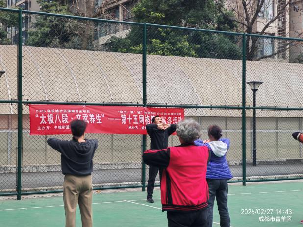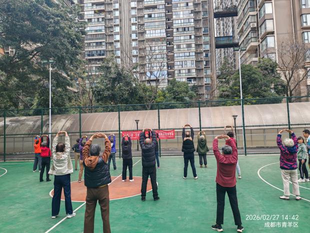 为弘扬中华传统健身文化,提升社区居民健康水平,,长城社区联合成都市常青树社会工作服务中心,于2026年2月27日在第十五网格院落成功举办了一场别开生面的八段锦健身活动,吸引了众多居民爱好者踊跃参与,现场气氛热烈非凡。