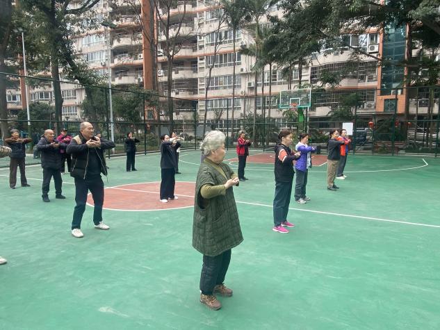 在练习过程中,教练穿梭于人群之间,对居民们的动作进行一对一指导。对于动作不规范的居民,教练会轻轻纠正他们的姿势,详细讲解发力点和呼吸配合。居民们也积极互动,相互交流心得,现场洋溢着浓浓的学习氛围。经过一小时的练习,大家逐渐掌握了八段锦的基本动作,动作越来越整齐划一,一招一式间仿佛形成了一股无形的力量,将活动推向高潮。