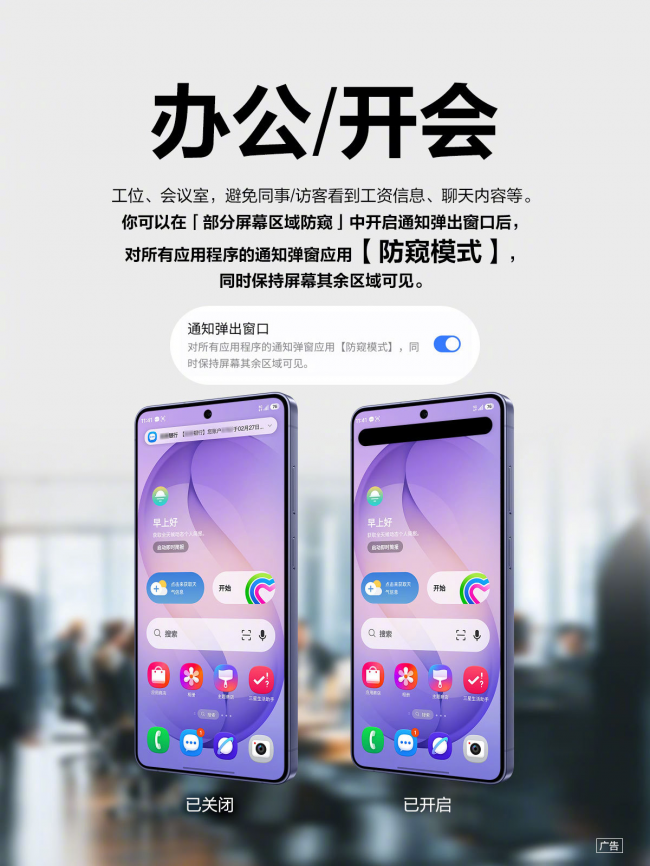 它不是你想象中那种“一键开启”的简单功能,支持四种个性化防窥模式:全屏防窥、自定义APP防窥、通知弹出窗口与智能识别密码场景防窥。通勤路上,地铁/公交/高铁,防止旁边人偷看你聊天/照片/支付页面,可以针对指定应用程序,开启防窥模式。办公/开会时,避免同事看到工资信息/聊天内容等,可以在部分屏幕区域防窥中开启通知弹出窗口后,对所有应用程序的通知弹窗应用防窥模式。