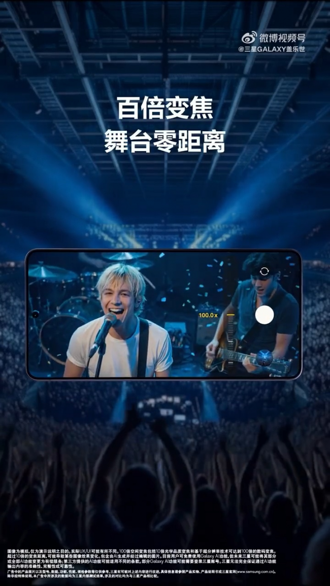但这次你带着Galaxy S26 Ultra。搭载超清2亿像素广角摄像头,同时支持AI赋能的空间变焦功能,百倍变焦画面稳定而清晰,拉近之后,舞台上的乐队成员能看清谁在弹吉他、谁在打鼓,就连面部表情也清晰可见。不是那种强行放大的模糊,是真的清晰。