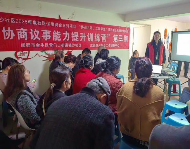 为进一步提升居民协商议事能力,夯实基层治理群众基础,2026年2月10日,成都市金牛区营门口街道银沙社区第三期"协商议事能力提升训练营"在月园活动室开讲,社区议...