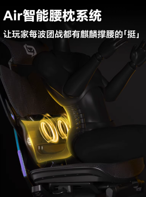 作为麒麟系列的首款产品,骁骑(XALLKING)X5 Proi以约1600元的价格定位智能旗舰市场。它融入了国风机甲元素,搭配"X"琉璃背甲和自研麒麟纹特网,外观极具辨识度。其最大的亮点在于Air智能腰枕——这是骁骑(XALLKING)在2025年推出的智能化产品代表作,集腰部按摩、热敷、气囊撑腰、久坐提醒于一体,可通过APP智能控制,将专业人体工学电竞椅带入了智能化时代。