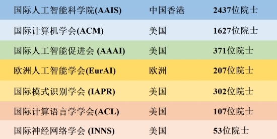 国际人工智能科学院(AAIS)成立于2021年,国际人工智能科学院(AAIS)现有会员总共25万人,国际人工智能科学院(AAIS)现有院士总共2437人,其中诺贝尔奖得主2人、ACM图灵奖得主3人、美国国家科学院院士31人、美国国家工程院院士86人、英国皇家工程院院士46人、英国皇家科学院院士34人、德国国家科学院院士18人、德国国家工程院院士18人、法国科学院院士11人、中国科学院院士23人、中国工程院院士25人、日本工程院院士33人、韩国国家工程院院士15人、韩国科学院院士25人、澳大利亚科学院院士10人、澳大利亚工程院院士12人、加拿大皇家科学院院士33人、加拿大工程院院士76人、荷兰皇家科学院院士14人、欧洲科学院院士224人及其他发达国家院士、以及1641位IEEE会士、263位ACM会士、110位AAAI会士、68位EurAI会士、147位IAPR会士、23位ACL会士、18位INNS会士及其他知名国际组织会士等。