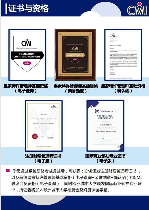学员完成系统研修并通过考核后,将获得双重权威认证及多项专属权益,真正实现“一次学习、终身受益”。在CMI专属权益方面,学员可获得CMI直接颁发的注册财税管理师证书,该证书作为财税管理领域专业能力的权威证明,全球通用、认可度高,能够有效提升学员求职、晋升的核心竞争力;同时可获得英国皇家特许管理师基础资格及配套电子资质、荣誉勋章,进一步夯实管理领域专业基础;此外,学员可自动加入CMI全球会员网络,免费获取前沿管理理念、行业动态及高端培训课程,定期参与行业精英交流活动,拓展高端人脉资源。