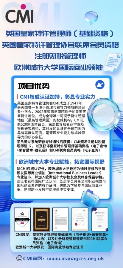 本次CMI与欧洲城市大学联合推出的注册财税管理师认证项目,凭借两大国际权威的双重背书、实战导向的课程体系及终身赋能的专属权益,为渴望突破职业瓶颈的财税从业者提供了优质的成长平台。尤其是CMI作为全球管理认证领域的权威机构,其资质已获得英国NHS、安永、劳斯莱斯等知名机构与企业的认可,进一步凸显了该认证的核心价值与行业认可度。无论您是深耕财税行业多年、寻求职业突破的从业者,是初入职场、希望抢占求职先机的新人,是计划跨界进入财税领域、追求高端发展的创业者,还是渴望融入高端圈层、与行业精英同行的从业者,该认证都将成为您职业进阶的核心助力,加速实现职业价值提升。