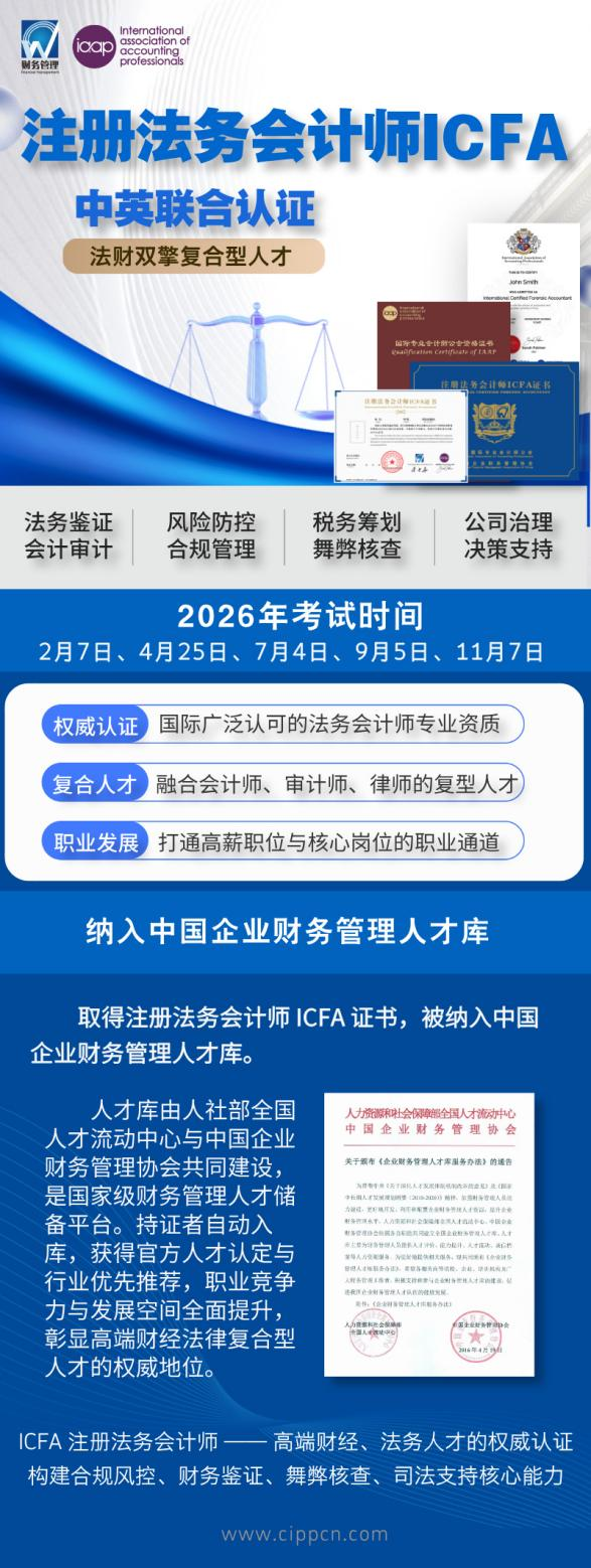 注册法务会计师(ICFA,International Certified Forensic Accountant)认证项目,由英国国际专业会计师公会(IAAP)与中国企业财务管理协会联合推出,实现国际权威标准与中国本土实践的完美融合,是目前国内财经法治交叉领域极具权威性、专业性与认可度的高端职业资格认证,为人才培养筑牢了权威根基,也为持证人职业发展赋予了核心竞争力。