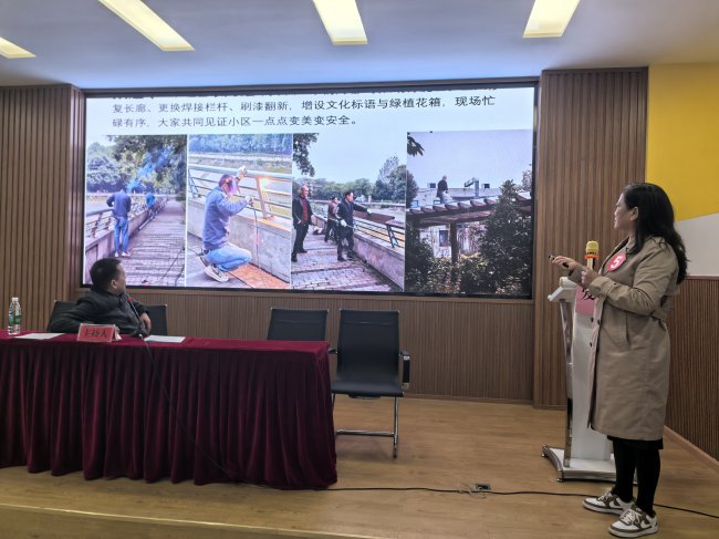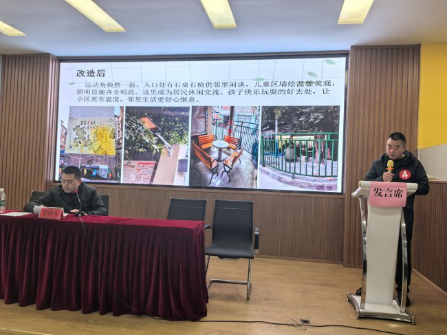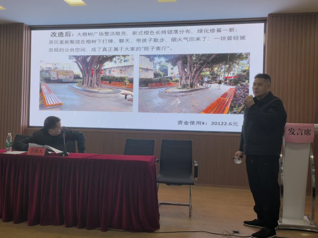 在项目分享与答辩环节,五个院落的实施主体依次上台,生动讲述了“为什么做”、“做了什么”以及“取得了什么成效”。新园4区将空旷的“闲置角”打造为兼具休闲与儿童游乐功能的“乐园角”;石灵十组让漏雨破旧的多功能活动室“老阵地焕发新活力”;新政府宿舍对老旧的文化长廊和栏杆进行修复美化,“让旧长廊承载新记忆”;汇鑫苑C栋着力破解历史遗留的安全隐患,拆除“堵心墙”、打通“安全门”;东林半岛则在榕树下开辟出居民协商议事的“新阵地”。每一个项目的背后,都是居民需求的有效回应、民主协商的充分实践和共建力量的生动凝聚。