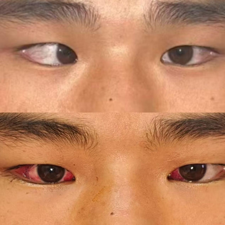 该患者的斜视推测是4年前突发的急性共同性斜视没有得到及时治疗发展而来,急性共同性内斜视是突然发生的眼睛向内偏斜,多在数天、数周内出现,双眼看向物体时会出现重影(复视),眼位向内偏斜,是常见的成人及儿童眼肌问题。常见原因包括长期过度用眼、熬夜、近距离用眼多;近视、远视未及时矫正;眼部疲劳、调节功能异常;部分与全身状态、精神压力、外伤等。治疗首先先找原因:矫正屈光、改善用眼、休息调节,早期可保守治疗:训练、配镜、药物等(部分人有效)。斜视度数稳定、保守治疗无效、复视明显6月 以上需行手术矫正。斜视矫正手术是安全有效的解决方案,既能矫正外观,更能恢复视觉功能。平时日常工作学习生活中建议大家合理用药避免长时间近距离用眼,每 30–40 分钟休息,保证睡眠,减少熬夜、过度刷手机,突然出现重影、眼斜,尽快眼科就诊,不要拖延。
