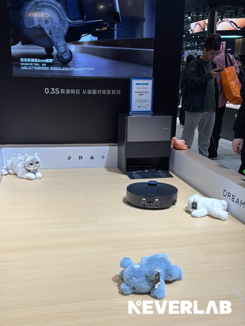 在追觅科技展馆内,NEVERLAB「趴趴系列」潮玩与智能家电设备实现场景化联动,通过生活化空间布置与沉浸式互动展示,生动诠释“AI科技+情绪治愈”的未来家庭生活形态,让智能设备不再是单一的功能工具,而是兼具陪伴感、氛围感与美学价值的家庭组成部分。此次跨界合作,不仅丰富了智能家居的场景体验,更为潮玩与智能科技行业的融合创新树立了全新标杆。