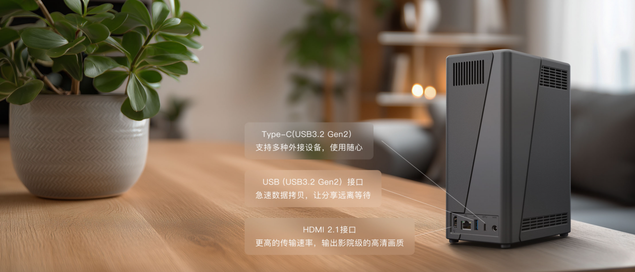 接口配置同样丰富实用,单2.5Gbps网口匹配主流2.5G内网环境,确保数据高速传输不瓶颈;配备USB3.2 Gen2标准的USB-A与USB-C接口各一个,可便捷连接移动硬盘、硬盘柜等外设,满足多设备数据互通需求;搭载HDMI 2.1接口,告别传统NAS接口单一短板,直连电视就能播放影音内容,实现存储设备与家庭娱乐的无缝衔接。