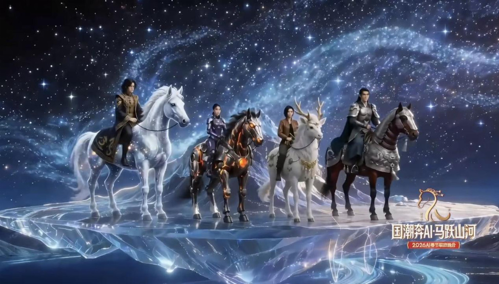 2026年2月19日,正月初三晚上,一场特殊的春晚在江苏卫视首播。22个节目,全部由人工智能生成。没有演员登台,没有现场观众,只有屏幕上一幅幅流动的画面——水墨风格的千里江山图里,骏马奔腾而出;敦煌飞天的飘带化作数据流,在数字空间中舒展。这台名为《国潮奔AI·马跃山河》的晚会,最终在江苏卫视、重庆卫视、山西卫视、安徽卫视以及多家网络平台同步播出,成为国内首台全流程AI创作的春节晚会。