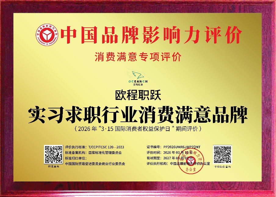 本次专项评价严格遵循规范、公正、自愿申请的基本原则,全程依据《中国品牌影响力评价通则》(T/CCPITCSC 120—2023)团体标准开展专业、系统的评价工作。在本次评选中,凯琛教育集团旗下专注留学生实习求职的专业品牌欧程职跃,凭借在留学生求职赛道的多年深耕积淀、全流程透明化的服务体系与始终如一的诚信经营准则,成功斩获「中国品牌影响力评价・消费满意专项评价・实习求职行业消费满意品牌」荣誉称号,成为实习求职领域的标杆品牌。