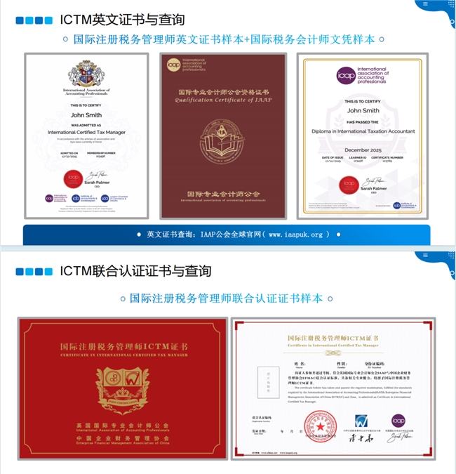 通过ICTM认证的学员,不仅可获得由英国国际专业会计师公会IAAP颁发的国际注册税务管理师ICTM的英文证书,和国际税务会计师文凭证书,还可获得与中国企业财务管理协会联合认证的国际注册税务管理师ICTM的中文证书,证明了持证人具备国际水准的专业能力,更赋予了其在跨国公司、四大会计师事务所、大型国企及税务机关中担任关键职务的“硬通货”资格。