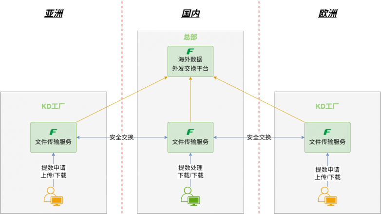 为了实现上述需求,该车企选择了Ftrans飞驰云联的《Ftrans MDE多区域文件交换系统》。该系统在国内搭建了海外数据外发交换平台,统一管理用户组织、登录认证、流程管控等;在海外区域则搭建了文件传输服务,为KD工厂提供高速下载项目文件的服务。