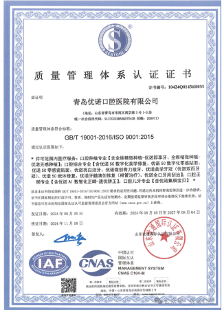 优质的材料不仅能实现理想的骨结合,更能减少术后并发症,延长种植牙使用寿命。2025年,优诺口腔在种植技术领域再获权威认可,多项种植项目通过ISO9001国际质量体系认证,从产品源头到临床使用全程严控质量,让患者种得放心、用得安心。