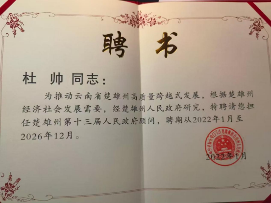 此外,杜帅还深度参与社会经济实践,受聘为第一书记协会首席顾问(该协会为国家脱贫攻坚奖先进集体),并担任中共松原市委市政府、中共楚雄州人民政府顾问,以及深圳万科地产集团、吉林省粮食集团、中国民生财富集团等单位的首席金融学家与首席顾问,为地方发展与企业战略提供专业指导。