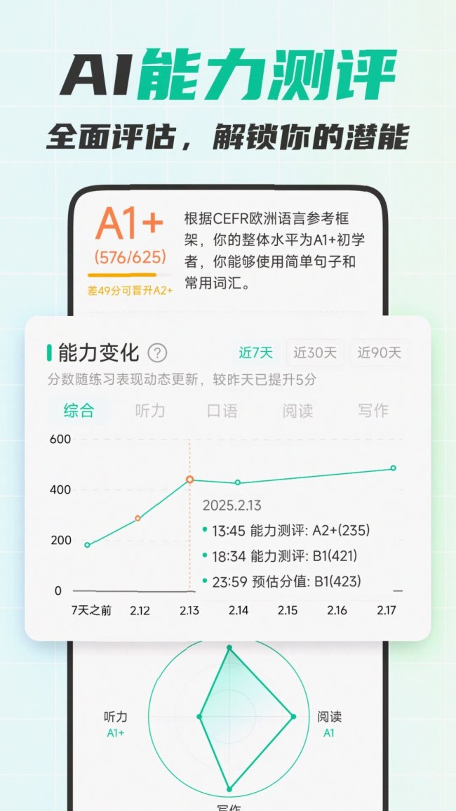 基于CEFR国际标准打造的智能英语水平测评系统,从A0入门到C2母语级全覆盖,精准定位你的英语水平,自动分析强弱项,实时更新水平能力分,追踪每一次进步,科学制定专属学习路径,真正做到测得准、练得快、用得上,考试备考阶段能清晰看到分数攀升轨迹,针对性补短板效率翻倍。