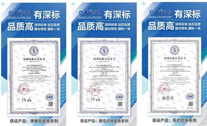 中深爱的是真空压缩(卷装)床垫、弹簧软床垫系列、现代软床系列深圳标准主起草单位。
