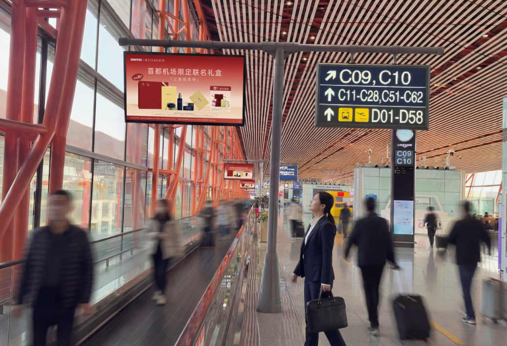 既然是在机场进行投放,机场的选择以及广告投放位置与形式至关重要:选择北京首都国际机场这类核心城市枢纽,是覆盖高净值人群的关键;而采用航站楼LED大屏+集合店灯箱的组合媒介形式,则能实现集中且高频次的触达,围绕主流人群的商旅出行轨迹,精准覆盖目标消费者,形成强大的品牌引爆力,让博奥真BIOAGEN的高端抗衰形象伴随旅客出行轨迹深入人心。