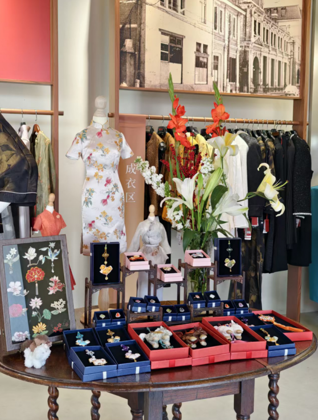 新品与经典服装展示区集中呈现红都经典力作与创新新品,涵盖承载民族记忆的中山装、青年装,蕴含非遗技艺的京式旗袍、新中式服饰、高端西装等核心品类,现场更特别展出2026年全新研发的16套新品服装,立体化呈现传统工艺与现代设计的融合成果。销售区则精准覆盖不同客群,从大众消费的成衣区到高端定制区域,一应俱全。值得一提的是,品牌将精湛制衣技艺延伸至生活美学,特设文创区,展售马年系列新品、非遗盘扣系列、环保系列以及香囊、书签等特色文创产品。
