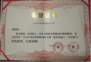 总体来说,廖昌明坚持12年在农业一线,创立了约2200亩零农残基地,通过土壤修复与生态种植,建成6大富硒柑桔园基地,获得3项绿色食品认证,5项有机转换认证,拥有11项商标,5项软著,3项发明专利,9项实用新型技术。他带领上万农民致富,创造出柑桔园“一地生多金”种植,果农欣然接受,被誉为科技达人。