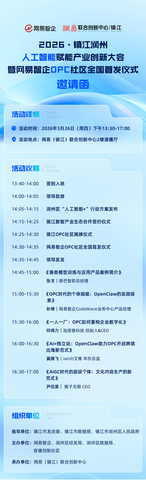 3月26日,由镇江市发改委、镇江市数据局、镇江市润州区人民政府指导,网易智企、润州区区经发局、润州区数据局、官塘创新社区联合主办,网易(镇江)联合创新中心承办的2026镇江润州人工智能赋能产业创新大会暨网易智企OPC社区发布仪式即将在镇江市润州区网易(镇江)联合创新中心盛大启幕。这是一场产业共振、生态共建的盛会,更是一次AI赋能、产业升级、个体崛起的启航!