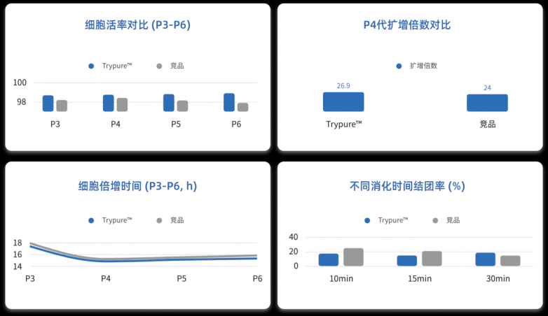 与市场主流竞品相比,Trypure™在细胞活率、倍增时间、扩增倍数及结团率等关键指标上全面领先。