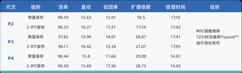Trypure™在常温15-30℃下保存6个月后,消化MSC细胞的关键参数(活率、结团率、扩增倍数)与2-8℃冷藏条件下完全等同,活性无衰减。