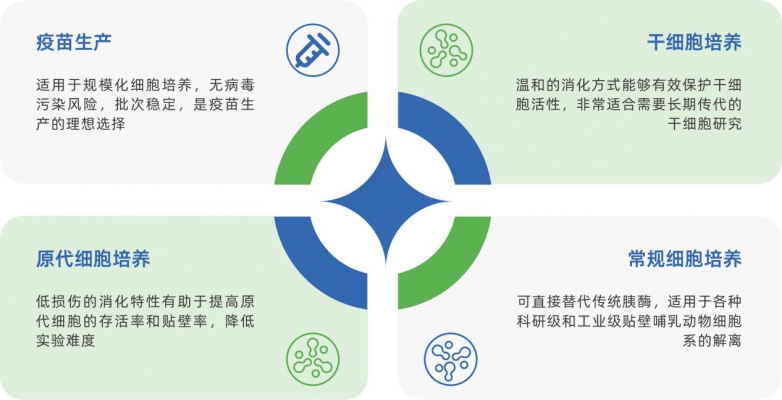 可直接替代传统胰酶,适用于各种科研级和工业级贴壁哺乳动物细胞系的解离。
