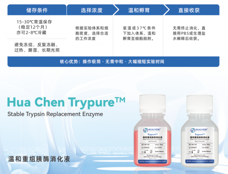 在细胞培养的日常实验中,消化传代是再熟悉不过的环节近日,华辰生物正式推出Trypure™温和重组胰酶消化液,给出了答案一、产品介绍华辰生物Trypu...