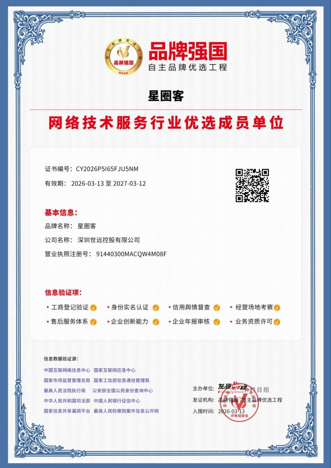 近日,深圳世远控股有限公司旗下核心品牌AI星圈客凭借卓越的技术创新能力与优质的服务体系,成功入选“品牌强国・自主品牌优选工程”,正式成为网络技术服务行业优选成员单位,这是对AI星圈客品牌价值与行业影响力的权威肯定。