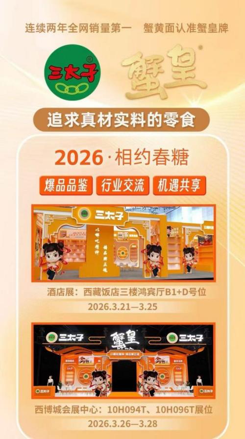 2026年3月21日,第114届全国糖酒商品交易会在成都盛大启幕。作为食品饮料行业洞察消费趋势、对接优质渠道、展现品牌实力的核心平台,本届春糖汇聚了海内外万千优质品牌,休闲零食赛道更是亮点纷呈。在参展品牌中,连续两年蝉联全网销量第一的“三太子蟹皇面”格外引人注目。品牌以“真蟹黄,非蟹黄味”的颠覆性产品理念,携核心爆品重磅亮相,凭借扎实的产品力、成熟的渠道验证和务实的招商政策,成为休闲零食展区的热门焦点。