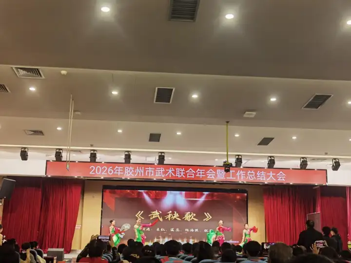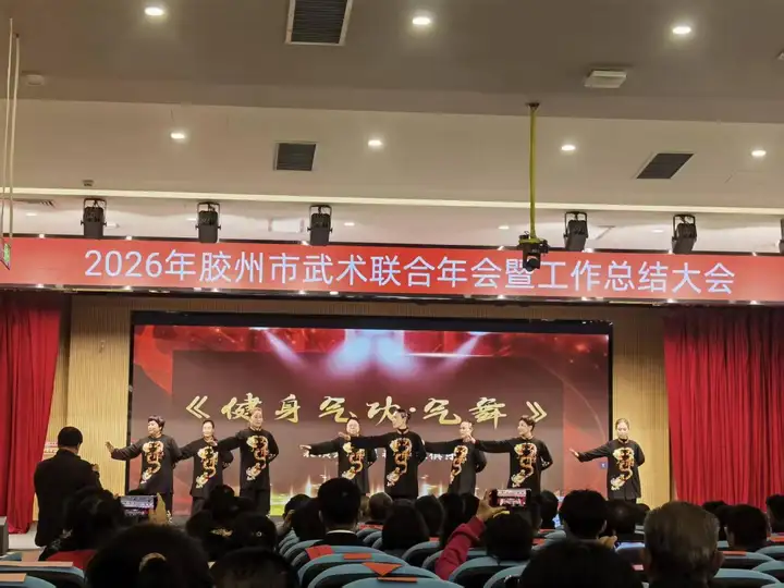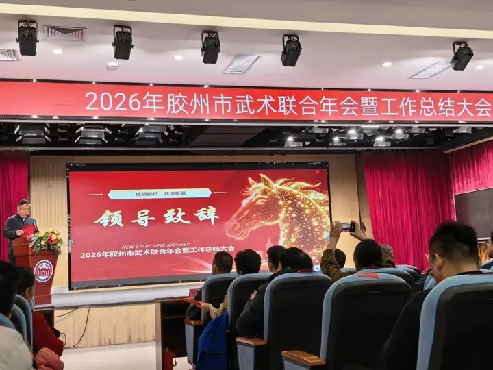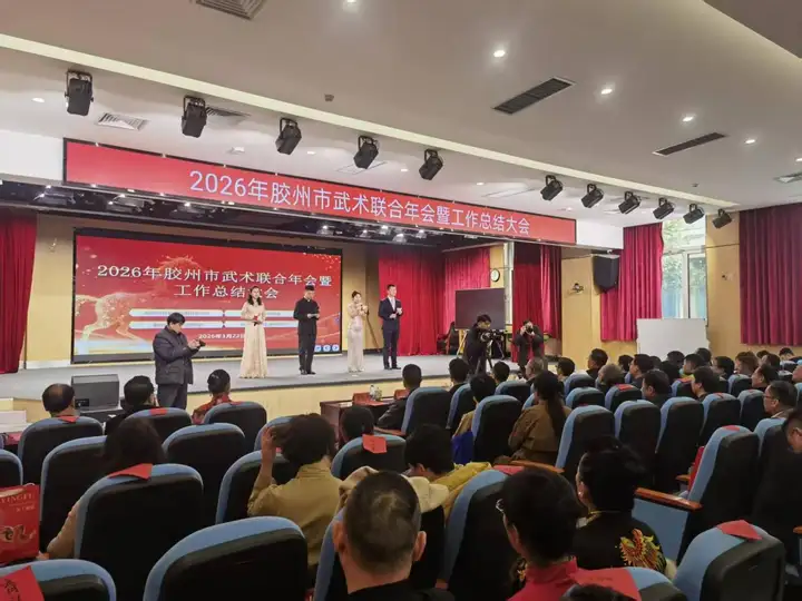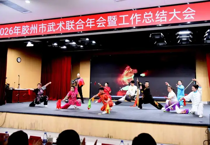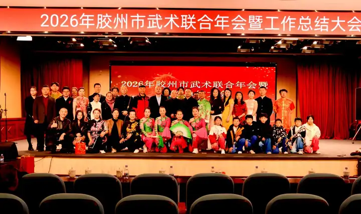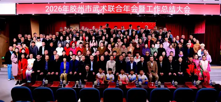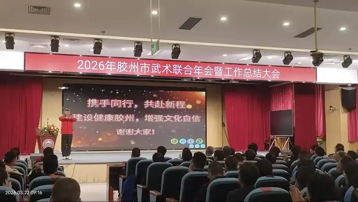 3月22日上午,2026年胶州市武术联合年会暨工作总结大会在胶州市瑞华实验小学隆重举行。本次大会由胶州市社会体育指导员协会、武术运动协会、健身气功协会、三铺龙拳研究会联合主办。胶州市政协副主席、市工商联主席于敬军出席并致辞,市老年体协主席于龙春,市教育和体育局党组书记、局长尹少杰,市体育发展中心主任袁鹏等领导及各界嘉宾、武术爱好者约280人参会。