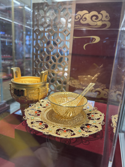 而在这些制作过程中,传统非遗技艺始终是核心。花丝镶嵌,是中国传统金工中最精细的一种技艺。匠人需要把黄金拉成极细的金丝,再通过掐、填、攒、焊、编等技法组成复杂纹样。因为工艺难度极高,这项技艺在2008年被列入国家级非物质文化遗产名录。与花丝并列的,是宫廷錾刻。通过冲、压、刻、镂空等手法,在金属表面塑造立体纹饰,让平面的金属拥有层次感与光影变化。