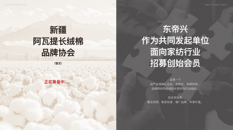 东帝兴总经理林宗文指出新疆阿瓦提长绒棉备受赞誉,却长期面临“有品类、无品牌”的现实困境。目前「新疆阿瓦提长绒棉品牌协会」正在筹备中,东帝兴作为共同发起单位,面向家纺行业招募创始会员,希望联合更多品牌的力量,让“阿瓦提长绒棉”从产地名称升维为真正的公共品牌,东帝兴愿与每一位品牌主理人携手努力,让世界看见中国阿瓦提长绒棉!