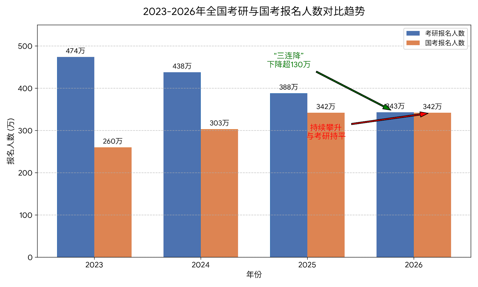 2026年全国硕士研究生招生考试报名人数为343万,较峰值时期的474万(2023年)下降超过130万,实现“三连降”。