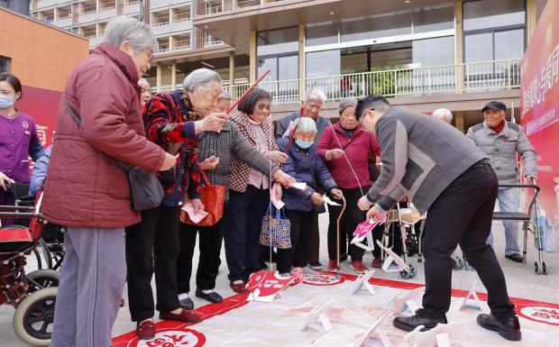 方寸棋盘间,长者在“拗九连福”中谋划布局,收获福慧,也铭记守护“钱袋子”的重要性;手持特制钓竿,“巧钓锦鲤”让长者在趣味中收获年年有余的祝福与防范锦囊;古风投壶场景下,“壶纳百福”让长者在感受传统魅力的同时,精准“射落”网络贷款乱象……每一枚通关印章都凝聚着节日祝福。集章完成后,工作人员为长者们送上了寓意吉祥的长寿面,现场温馨祥和,笑语不断。