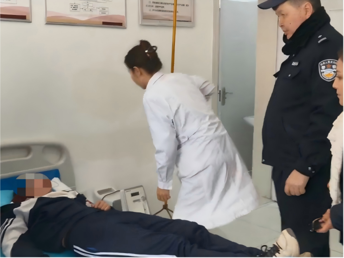 执勤民辅警见状,第一时间冲上前查看学生状况,发现该学生意识模糊、身体虚弱,情况危急。为争取救治时间,民辅警毫不犹豫地将晕倒学生抱起,以最快速度送往附近医院进行救治。途中,民辅警一边照顾学生,一边联系学校老师及学生家长,同步告知情况,确保后续救治工作有序衔接。