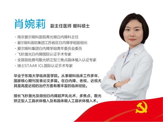 卢大爷的手术由南京爱尔眼科医院青白科主任肖婉莉主刀。肖婉莉是副主任医师、眼科硕士,爱尔眼科医院集团江苏省区白内障学组副组长、爱尔眼科集团白内障学组青年委员会委员,同时也是飞秒激光白内障国际认证手术专家、全国首批蔡司散光矫正型三焦点晶体植入认证专家、瑞士STAAR ICL国际认证手术专家。