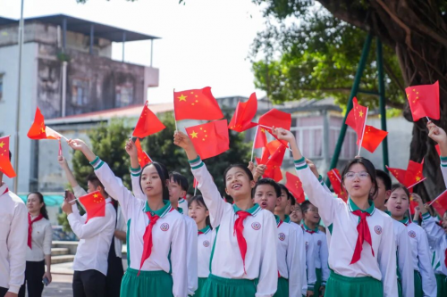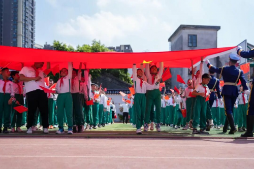 抚摸国旗环节则将现场气氛推向另一个高潮,赤心国旗护卫队队员们庄严擎起五星红旗走向操场,孩子们近距离抚摸,感受这抹“中国红”的厚重与温度。与此同时,全场千余面小国旗齐齐舞动,汇聚成一片翻涌的红色海洋。情感在仪式中凝结,信仰在互动中扎根。