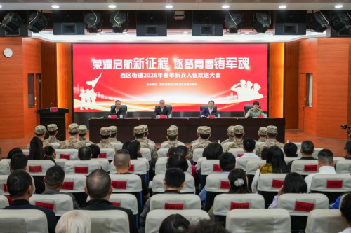 春意盎然,战鼓催征。3月14日上午,西区街道隆重举行2026年春季新兵入伍欢送仪式。街道党工委书记郭卫华,党工委副书记、办事处主任谢军杰,人大工委主任王远胜,党工委委员、武装部部长叶子昌,相关部门负责人、社区“两委”班子及入伍新兵家属齐聚一堂,共同见证这一光荣时刻。一批优秀的西区青年,即将肩负家乡人民的殷切期望,奔赴火热军营,开启保家卫国的光荣征程。