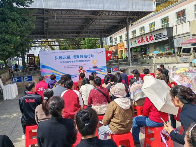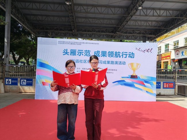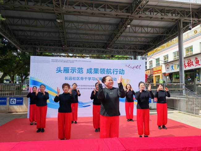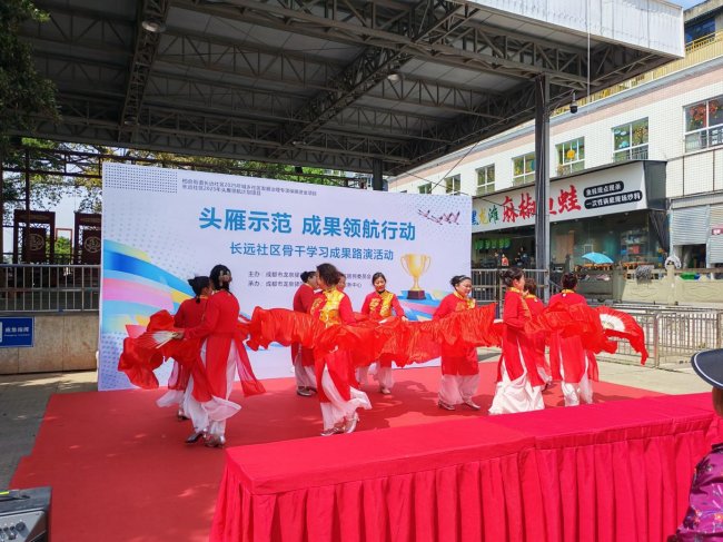 活动伊始,社工以热情饱满的开场,详细介绍了本次路演活动的背景、核心目的、流程安排及到场观摩团成员,用温暖的话语拉近了现场距离,迅速营造出热烈有序、积极向上的活动氛围,为整场路演拉开了精彩序幕。路演环节中,各“头雁”骨干代表依次登台,以多元形式全方位、多角度展现学习成果,每一份展示都饱含着骨干们的用心与担当,每一个瞬间都彰显着社区治理的温度与力量。文艺表演精彩纷呈,扇子舞《家和万事兴》舞姿翩跹,传递着邻里和睦、家国安康的美好期许;健身操《感到幸福你就拍拍手》活力四射,展现出社区骨干积极向上、热爱生活的精神风貌,赢得现场阵阵掌声。