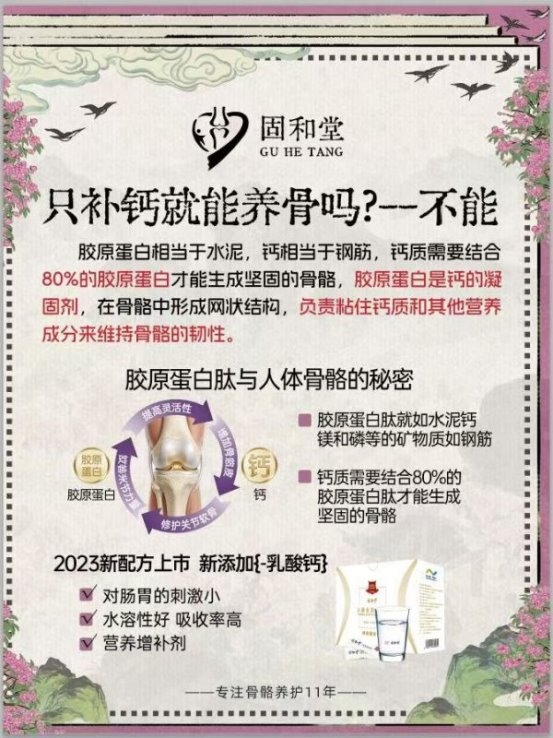 内服固和堂水解胶原蛋白肽,升级为特殊膳食食品,采用欧洲进口原料“牛皮牛软骨萃取的多肽精准配比”与“协同增效基质”,复配L-乳酸钙等微量元素,靶向补充骨骼所需营养,助力修复软骨、强健骨密度,从根源养护骨骼,为父母筑牢健康根基。