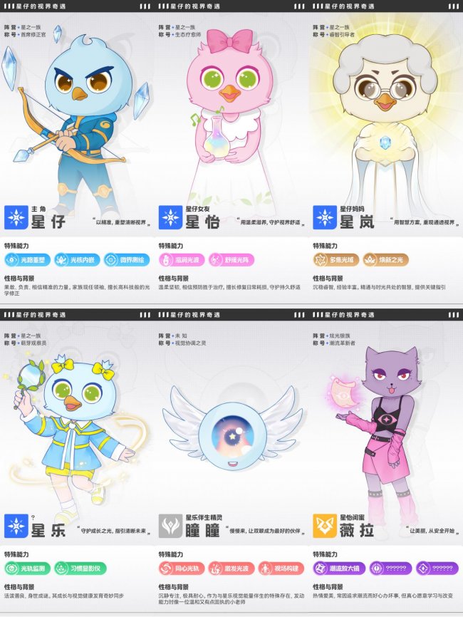 据创作团队负责人包主任介绍,故事主线围绕星辉眼科IP形象“星仔”在人类视界的冒险展开。创作团队巧妙地将抽象的病理机制转化为具象的奇幻设定:当人类因长期不良用眼产生“视觉阴霾”时,负能量会撕裂时空打开“暗影裂隙”,滋生以破坏清晰视觉为乐的“眼病邪灵”。为了驱散阴霾,来自光之世界的守护者家族——“星之家族”(包括星仔、女友星怡、母亲星岚、弟弟星乐,以及伴生精灵瞳瞳和闺蜜薇拉等)携手穿越裂隙,帮助人们重现清晰世界。而为了让这些守护者形象更加鲜活立体,更好地承载这一宏大世界观,视觉设计也迎来了同步升级。