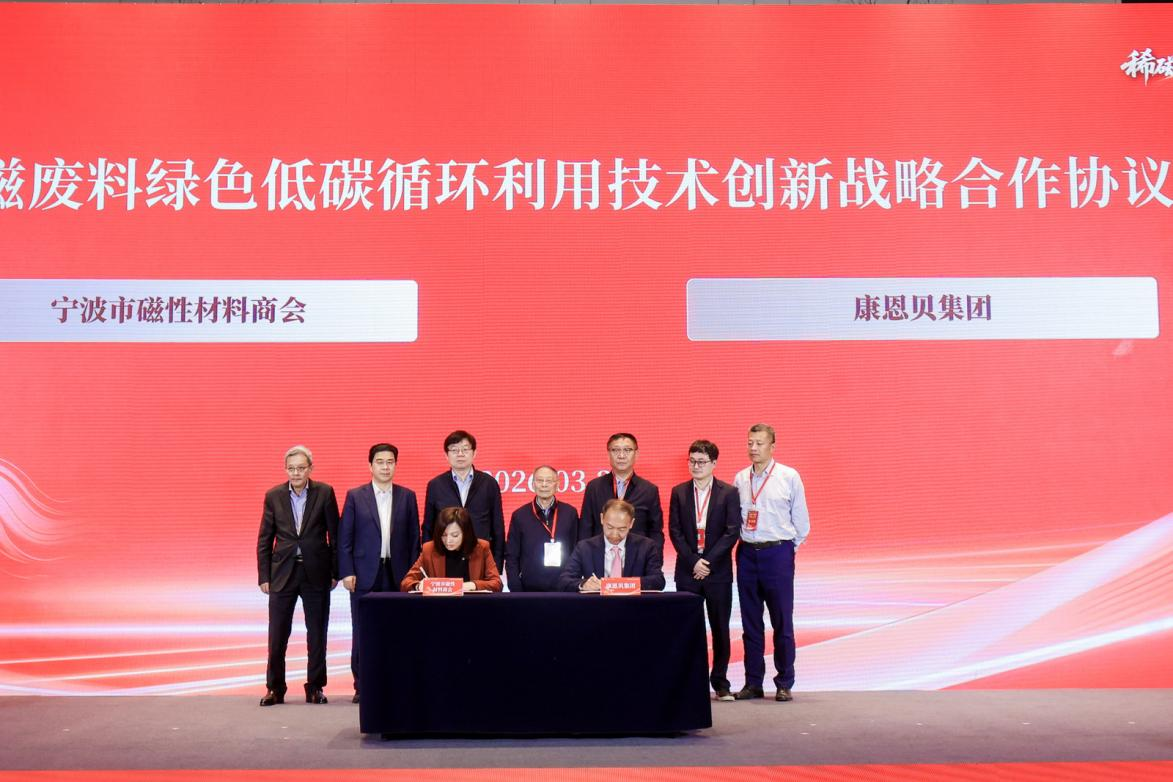 上午的议程中,一系列重磅合作与平台揭牌成为焦点。为推进稀土永磁废料的绿色低碳循环利用,在中国科学院院士、南京大学教授都有为,全国政协常委、中国工程院院士李卫,康恩贝集团董事长兼首席执行官胡季强,宁波复能稀土新材料股份有限公司董事长邹宁等嘉宾及全体参会代表的共同见证下,宁波市磁性材料商会秘书长吴玥臻与康恩贝集团产业发展总监胡玖坤正式签署《稀土永磁废料绿色低碳循环利用技术创新战略合作协议》。这标志着双方将携手攻克废料循环利用关键技术,在稀土战略资源绿色循环的征程上迈出了坚实而深远的一步。